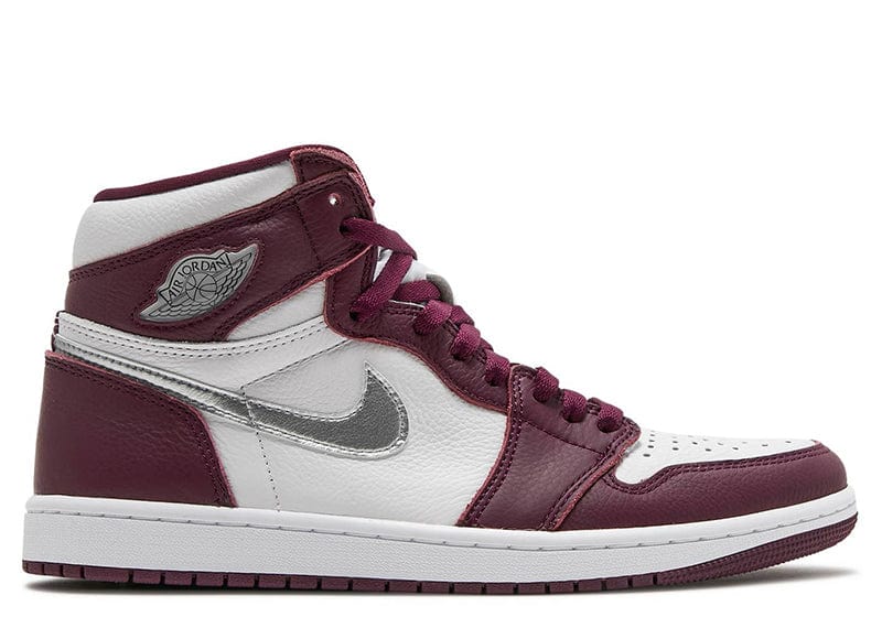 The Air Jordan 1 High Bordeaux features a white with Bordeaux overlays and metallic silver Swooshes. From there, matching woven tongue labels and a Wings logo on the collar nod to the original 1985 Jordan 1 design.